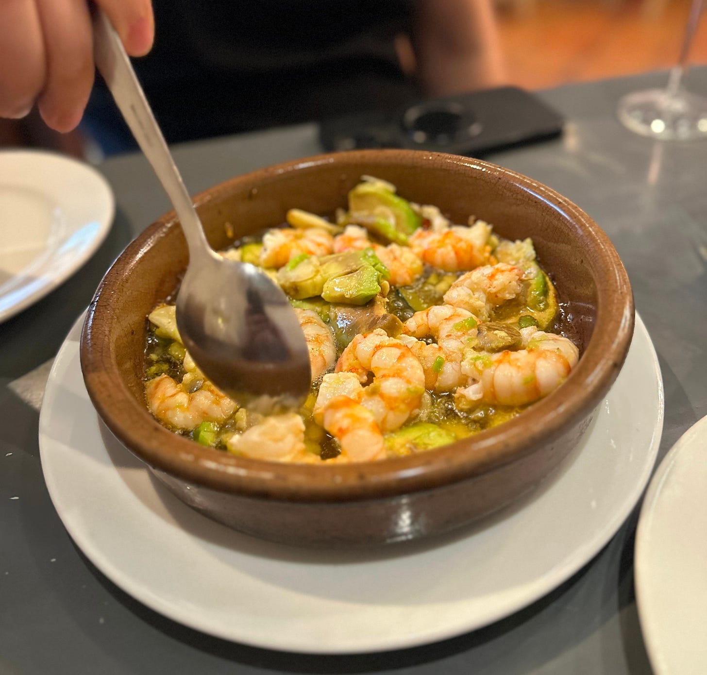 My favorite dish was the langostinos con aguacate, which was shrimp and avocado seared in garlicky olive oil served on a sizzling hot plate. It was worth risking my minor avocado allergy for it, especially since I haven’t had any reactions from the avocados in Spain. The salmorejo con guarnición was also enjoyable here.